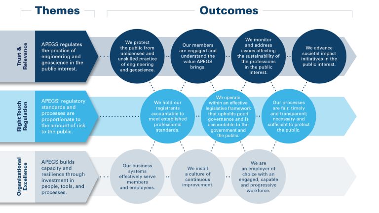 Engineering and geoscience impact every aspect of our lives. APEGS protects public safety by ensuring that Saskatchewan’s engineering and geoscience professionals have the education, experience and ethics to practice. As we look to the future, APEGS remains committed to our responsibility to protect the public. We adapt, innovate, and lead, ensuring that regulation of engineering and geoscience in Saskatchewan not only meets the needs of today but anticipates the challenges of tomorrow. Our five-year strategic plan sets out a path for APEGS to continue as a progressive and trusted regulator.