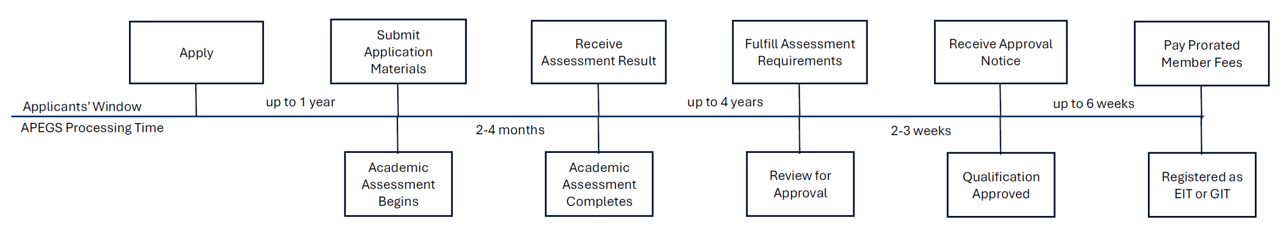 The overall registration time varies. It is mostly dependent on the time taken by applicants to submit required documents and/or complete any assessment assigned requirements. Applicants have a 1-year window to submit required application materials after applying, and a 4-year window to complete any assigned requirements after receiving the assessment result. When your academic qualification is deemed to be met and all the required submissions are completed, it generally takes 2-3 weeks for APEGS to approve your EIT or GIT membership.